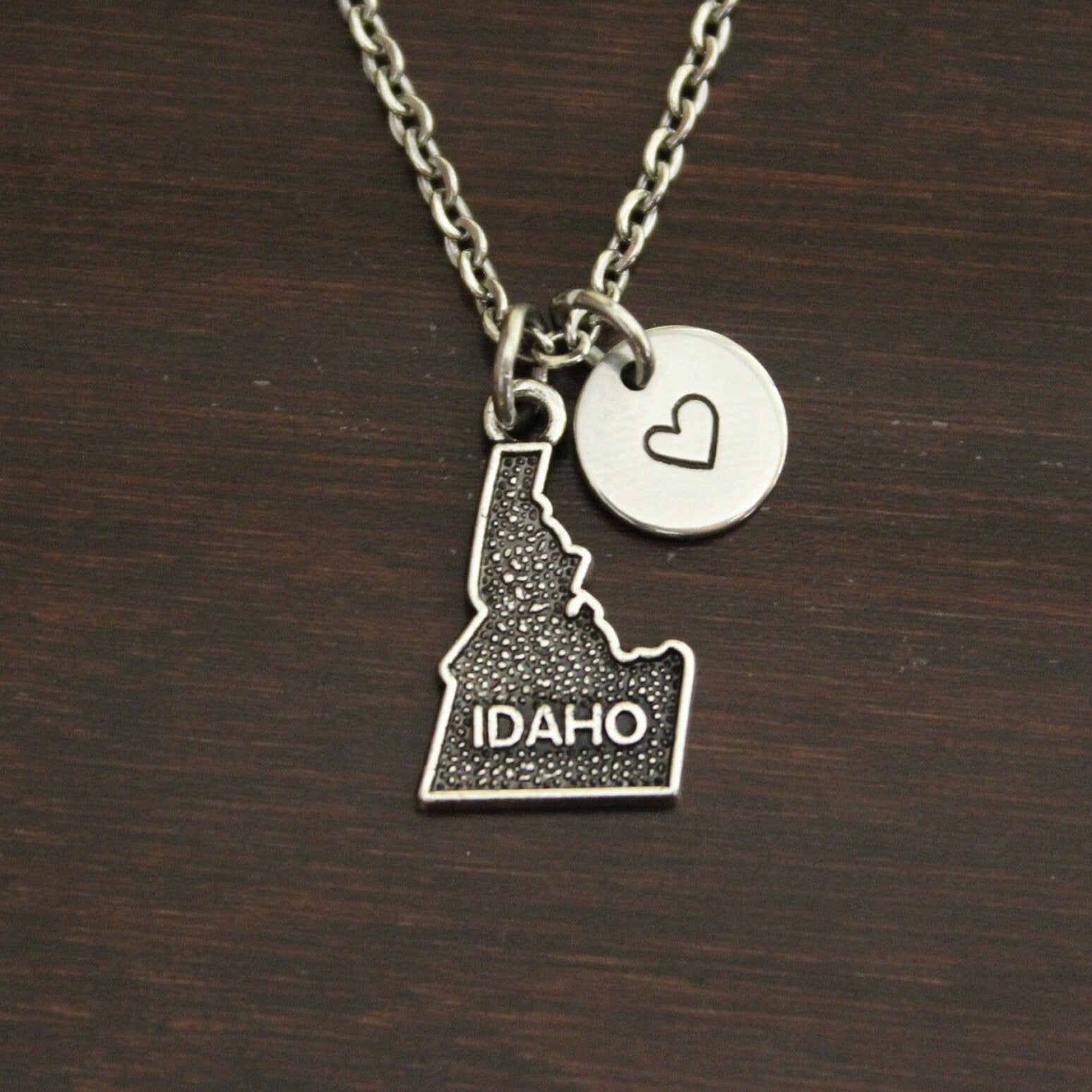 This necklace comes with a Idaho charm, choice of an initial, bead or stamped heart and a chain.