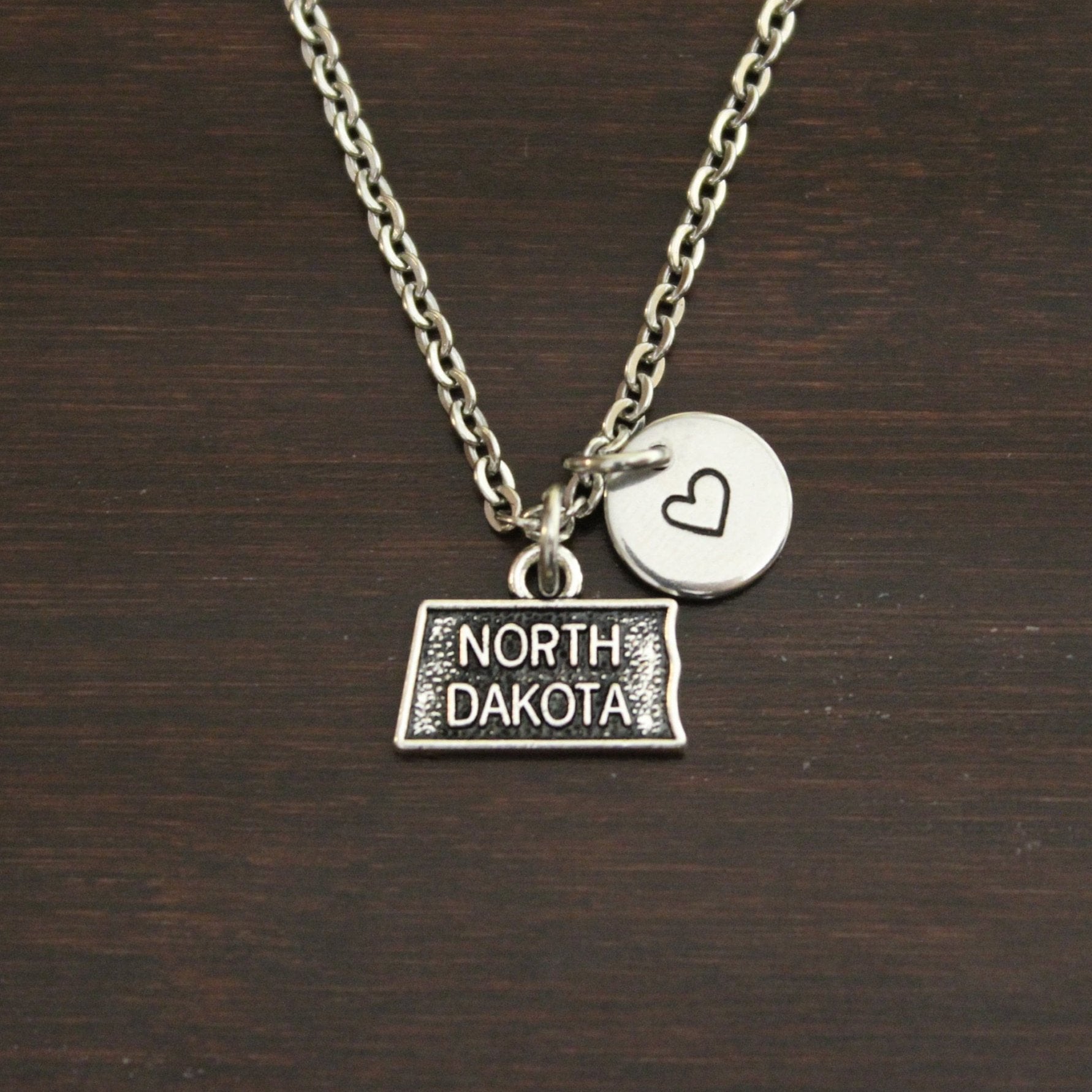 This necklace comes with a North Dakota charm, choice of an initial, bead or stamped heart and a chain.