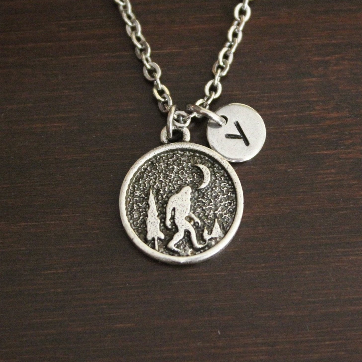 This necklace includes a mountain range with sasquatch/yeti charm, choice of an initial, bead or stamped heart and a chain.