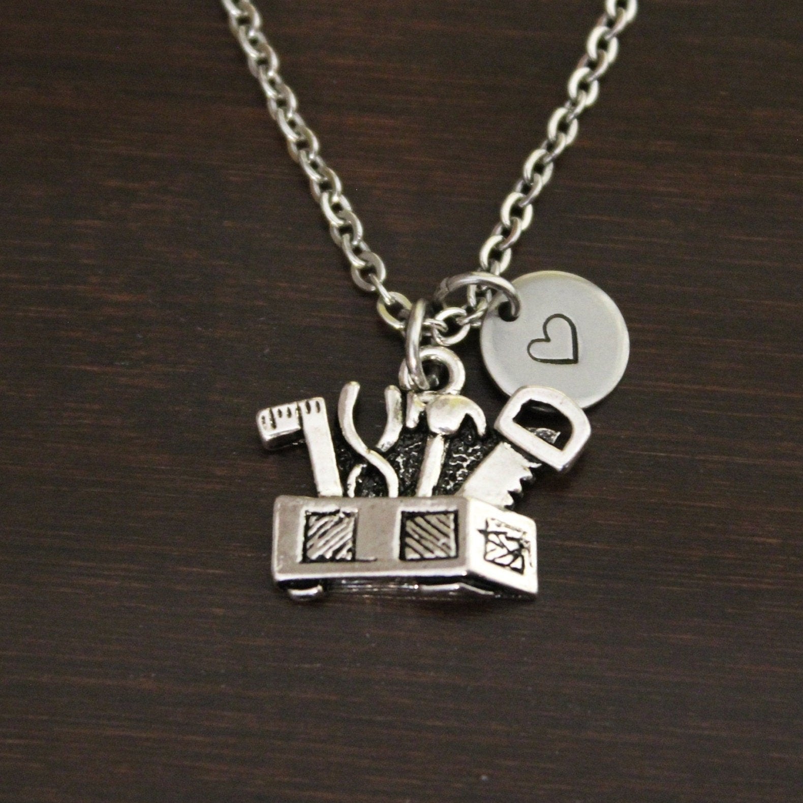 This necklace has a toolbox charm, choice of an initial, bead or stamped heart and a chain.